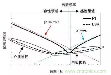 共振點附近:頻 率升高,則|Z|將受寄生電感或電極的比電阻等產生的ESR影響,偏離理想電容器(紅色虛線),顯示最小值。|Z|為最小值時的頻率稱為自振頻率,此 時|Z|=ESR。若大于自振頻率,則元件特性由電容器轉變為電感,|Z|轉而增加。低于自振頻率的范圍稱作容性領域,反之則稱作感性領域。