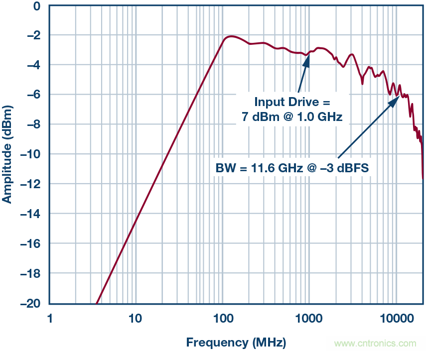 圖7顯示了通帶平坦度,證明在RF ADC之前增加一個THA可以實現 10 GHz的帶寬,從而充分擴展AD9689的模擬帶寬。