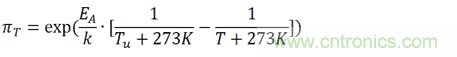 公式中,αf為測試的加速因子,也就是加速(后綴為a)測試條件下MTTF(Mean Time To Failures,平均無故障時間)與參考(后綴為u)測試條件下MTTF之比。EA是活化能,在0.79eV和0.95eV之間,k為玻爾茲曼常數(shù)。指數(shù)x為相對濕度的影響,指數(shù)y為電壓的影響,都是經(jīng)驗(yàn)數(shù)據(jù),但是必須通過實(shí)際評估來確認(rèn)。我們把此加速模型擴(kuò)展到壽命預(yù)估模型中。