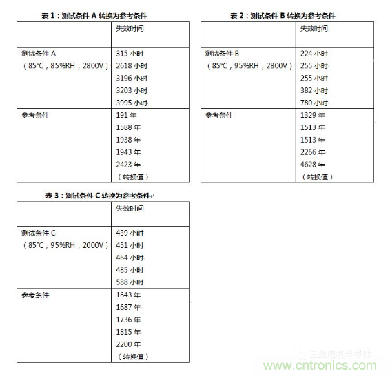 這里,參考條件定義為RHu=75%,Tu=25℃和Vu=1500V。通過公式(1),可以得到測試條件A中的加速因子αf_A為5.31k,測試條件B中的加速因子αf_B為52.0k,測試條件C中的加速因子αf_B為32.8k。綜合這些加速因子,溫濕反偏試驗(yàn)測試A、測試B和測試C轉(zhuǎn)換為如表1、表2和表3所示的參考條件。
