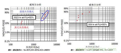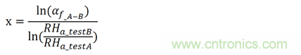 如圖4所示,在測試條件A的平均壽命為3023個小時。同樣,如圖5所示,在測試條件B的平均壽命為309個小時。所以,從相對濕度85%到相對濕度95%,加速因子αf_A-B通過計(jì)算為3023/309=9.78。相對濕度的經(jīng)驗(yàn)影響因子x通過下式計(jì)算: