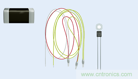 從左至右:安裝在印刷電路板上的SMT正溫度系數 (PTC) 傳感器、與電機繞組進行集成的正溫度系數 (PTC) 傳感器、安裝在散熱片上帶接線端子的正溫度系數 (PTC) 傳感器。