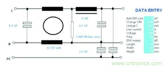 知道設備的干擾特性和輸入阻抗特性后,設計或者選擇一個濾波器就變得簡單了。如果使用一個現成的濾波器,可以調用過去積累的濾波器數據庫,比對濾波器參數,找到一個合適的濾波器。如果沒有合適的或者想專門設計一個專用濾波器,可以借助專用的濾波器設計軟件。在確定一個濾波器模式后輸入濾波器一些簡單的約束條件,設計軟件根據阻抗特性自動計算出最合適的組件值,以及提供最合適的衰減。(如圖6所示)