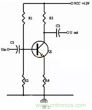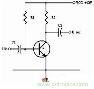 同理,當(dāng)輸入信號(hào)減小時(shí),則Ib減小,Ic電流減小,則電阻R2的電壓U2=Ic×R2會(huì)隨之減小,Uce=VCC-U2,會(huì)變大。在輸入信減小時(shí),Uce最大變化是從1/2的VCC變化到VCC。這樣,在輸入信號(hào)一定范圍內(nèi)發(fā)生正負(fù)變化時(shí),Uce以1/2VCC為準(zhǔn)的話就有一個(gè)對(duì)稱的正負(fù)變化范圍,所以一般圖1靜態(tài)工作點(diǎn)的設(shè)置為Uce接近于電源電壓的一半。