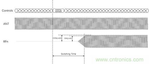 開關時間(Switch Time)或切換時間指的是開關從“導通”狀態(tài)轉(zhuǎn)變?yōu)?ldquo;截止”狀態(tài)或者從“截止”狀態(tài)轉(zhuǎn)變?yōu)?ldquo;導通”狀態(tài)所需要的時間。具體來講是指從DUT接收到通道切換命令,到在被切換到的通道上信號的功率達到滿幅度值的90%的時間。