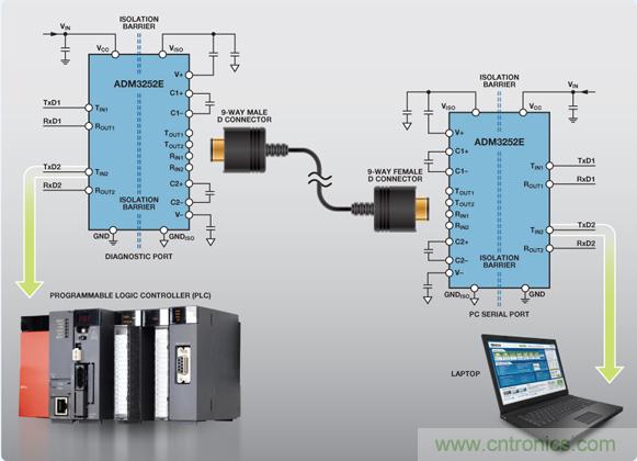 如圖 2 所示,隔離柵在 RS-232 總線和與該總線相連的每個系統之間提供電隔離,既允許在兩點之間傳輸數字數據,又可防止接地環路電流流過;這樣可以消除耦合到通信電纜上的噪聲,從而降低信號失真和誤差。