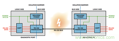 要提供隔離式 RS-232 通信接口,兩端的器件必須與所連的RS-232 電纜相互隔離。要隔離數據鏈路,則必須對數據信號線路和用于驅動該電纜的電源進行隔離。來自診斷端口上UART 的數據需要跨越隔離柵并傳輸至隔離總線側上的RS-232 收發器。本地 5 V/3.3 V 電源也需要跨越隔離柵來為隔離總線側上的 RS-232 收發器供電。工業 PC 端也同樣需要如此:數據和電源均需要跨越隔離柵(圖 3).通過將器件與 RS-232 電纜網絡隔離開來,診斷端口和工業 PC電路均受到保護,不受惡劣環境下可能耦合到 RS-232 電纜上的瞬變影響。隔離還可以中斷因診斷端口和工業 PC 端存在不同接地電位而可能出現的接地環路。RS-232 總線上可能出現的高共模電壓不能跨越隔離柵,從而保護隔離數據的用戶。