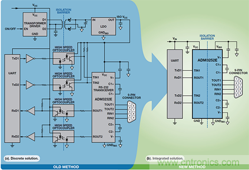 為了解決這一問題,ADI 公司研發并制造了一款完整的全集成式解決方案,利用微變壓器跨越隔離柵實現信號和電源傳輸。這是對我們完善 iCoupler 技術的延伸,是一種突破性的替代方案,稱為 isoPower。在單個器件中便可實現高達 2.5 kV 的信號和電源隔離,因而無需體積龐大、價格昂貴且難以設計的隔離電源。它可以顯著縮減典型隔離式 RS-232 接口的電路板面積、設計時間和隔離系統總成本。下文介紹兩種適用該技術的典型RS-232 設計情況。