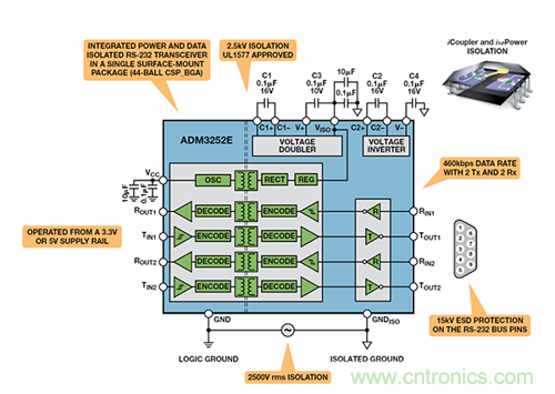 ADM3252E即是這樣的一個例子,它是一個緊湊器件中的隔離式雙通道RS-232 收發器。iCoupler隔離技術至少在以下五個方面克服了舊式光耦合器解決方案所造成的限制:集成(由于iCoupler支持雙向操作,因此可縮小總體尺寸并降低系統成本)、性能更高、功耗更低、易于使用且可靠性更高。