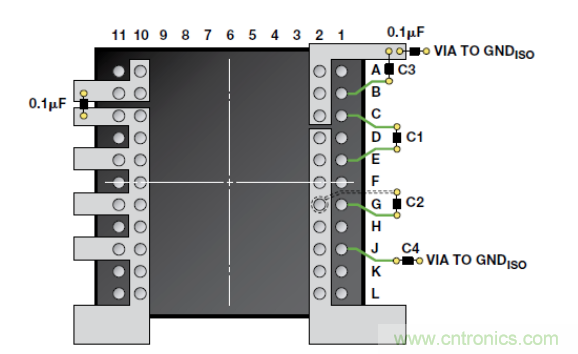 隔離收發器的PCB布局對于確保在實際設計中實現2.5 kV的額定隔離性能至關重要。主要考慮因素是邏輯端GND和總線端GND之間的爬電距離(沿殼體最短距離)和電氣間隙(最短空氣距離)。ADM3252E的邏輯接口不需要外部電路。輸入和輸出供電引腳需要電源旁路(圖 7)。欲了解有關PCB布局指南和輻射(EMI)控制結構的更多信息,請參考AN-0971 應用筆記“isoPower器件的輻射控制建議”。