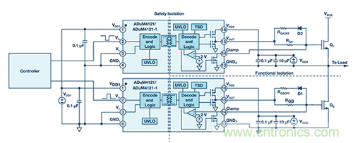 圖6. 采用ADuM4121隔離式柵極驅動器的半橋設置中的隔離柵