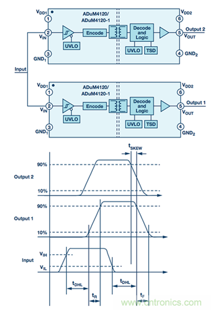 如圖5所示,傳播延遲偏斜被定義為器件間偏差。對于具有多個輸出通道的器件,此規格的表述方式相同,但被稱為通道間偏斜。傳播延遲偏斜通常不能在控制電路中予以補償。