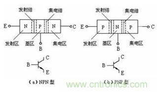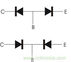 2.發射結和集電結都是屬于pn結,具備pn結的特性,因此其結構相當于一個極(陰極和陰極或者陽極和陽極)并聯在一起的兩個二極管,這個公共的電極就是基極,而另外兩個極就是集電極和發射極;見圖二,上面的對應的是npn型三極管,下面的對應的是pnp型三極管;