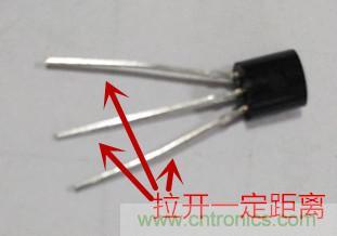 1.首先將三極管的三個管腳前后或者左右拉開一定距離,以便于測量;這樣可以避免表筆短路,如下圖三所示: