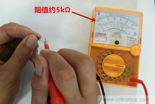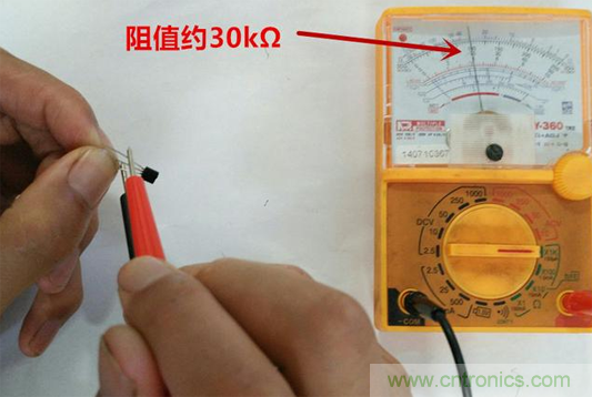 2.然后用拇指和食指捏住基極和另一個腳(假定該腳為集電極),方法同上,記錄顯示值R2;
