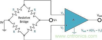 惠斯通電橋(或單臂電橋)電路應(yīng)用非常廣泛,如今在現(xiàn)代運(yùn)算放大器中,我們可以將惠斯通電橋電路與各種傳感器連接。不同于將一個未知阻值與已知阻值相比,惠斯通電橋在電路中有很多用法。惠斯通電橋電路就是在電源端和接地間兩個簡單的電阻串并聯(lián),當(dāng)電橋達(dá)到平衡時兩個并聯(lián)分路間產(chǎn)生零壓差。