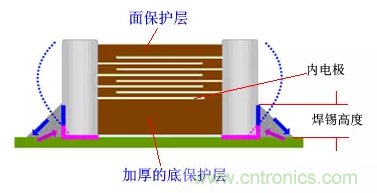 由于保護(hù)層厚度部分是沒(méi)有內(nèi)電極的,這部分的BaTiO3陶瓷不會(huì)發(fā)生形變,當(dāng)兩端的焊錫高度不超過(guò)底保護(hù)層厚度,這時(shí)產(chǎn)生的形變對(duì)PCB影響要小,有效地降低噪聲。