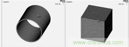 網(wǎng)格劃分對(duì)有限元的求解及其重要,單元越小,網(wǎng)格越細(xì),則離散域的近似度越好,計(jì)算結(jié)果也越精確,但計(jì)算量及誤差都將增大。本文建立的線圈模型是一個(gè)規(guī)則的柱體,采用體掃掠方式劃分網(wǎng)格。空氣模型經(jīng)過澆筑之后形狀變得復(fù)雜,采用自由方式劃分網(wǎng)格。圖2為線圈和空氣的有限元模型,最后通過numcmp命令將其澆筑在一起。