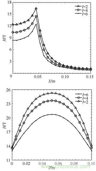 當(dāng)l一定時(shí),徑向距離上的磁場強(qiáng)度在半徑范圍外隨著距離增大顯著減小。縱向距離的磁場強(qiáng)度隨著距離增大先增大后減小。在l=Rm處,磁場強(qiáng)度均有最大值,同時(shí),匝間距的增大使得線圈的總高度增加,磁場覆蓋范圍增加。