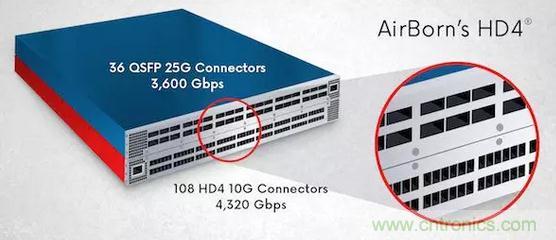 圖2:針對高密度設(shè)計的AirBorn 10GHD4®連接器可在同一托架系統(tǒng)內(nèi)提供比25G QSFP連接器更高的吞吐量,從而實現(xiàn)組件和能源成本節(jié)省。