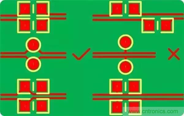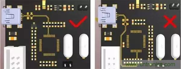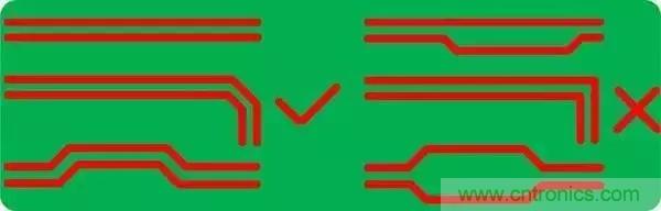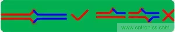 3.對稱平行走線,這樣能保證兩根線緊耦合,避免90°走線,弧形或45°均是較好的走線方式(√為合理的方式,×為不合理方式);