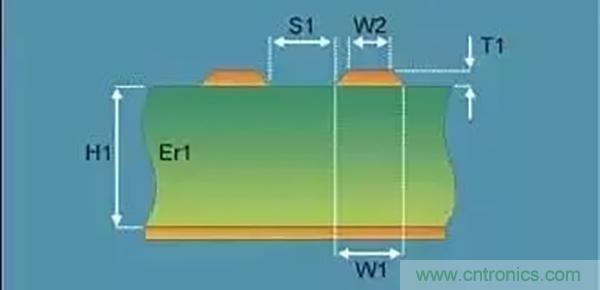 因為差分阻抗影響差分信號的眼圖、信號帶寬、信號抖動和信號線上的干擾電壓。差分線阻抗一般控制在90(±10%)歐姆(具體值參照芯片手冊指導),差分線阻抗與線寬W1、W2、T1成反比,與介電常數Er1成反比,與線間距S1成正比,與參考層的距離H1正比,如下圖是差分線的截面圖。