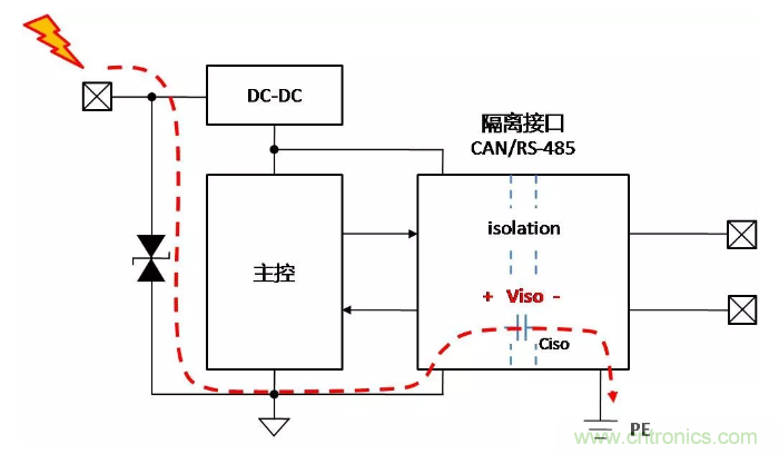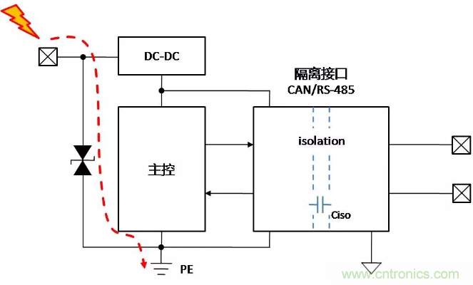 假設控制側均做了足夠的保護措施,當控制側接口受到靜電放電時,能量通過控制側保護器泄放至PE,對隔離通信接口基本無影響,如下面圖2。