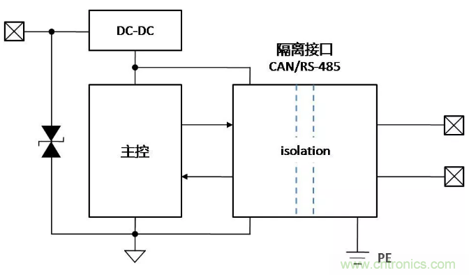 總線增加隔離固然可以保證總線穩定可靠地通信,但是帶隔離通信接口的設備,在復雜的環境或安裝狀態下,接口會表現出完全不同的ESD特性,了解ESD對接口的影響機理,才能有針對性地增加保護器件,提升隔離接口的ESD能力。下面以帶有隔離CAN或RS-485通信接口為例,對常見的設備狀態下,ESD的作用機理進行分析,并提出相應的改善措施。