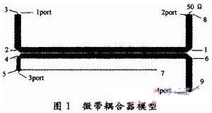 微帶定向耦合器在ADS中的模型如圖1所示。是一個(gè)四端口器件,中間是一段耦合線。四個(gè)端口分別連接于外部的50Ω端口。從5點(diǎn)到7點(diǎn)是高阻抗線,7端點(diǎn)接地,這個(gè)長(zhǎng)度是一個(gè)變量。連接每個(gè)端口(3端口除外)的微帶線寬度是2.25mm,長(zhǎng)度是14.4mm,3端口連接的微帶線寬度是1.4mm,長(zhǎng)度是5mm。耦合線的長(zhǎng)度是57.7mm,導(dǎo)帶寬度是2.1mm,導(dǎo)帶間距是O.45mm。本文主要討論高阻抗線的作用,所以先將高阻抗線長(zhǎng)度置于零。PCB板采用PTFE材料,介電常數(shù)是2.5,厚度是0.5cm。