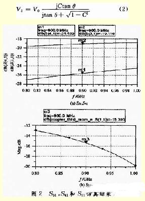 圖2(a)是S31和S41的圖,在900MHz時(shí)S31為-19.116dB,S41為-25.589dB。圖 2(b)是S11的圖,在800MHz~1GHz之間,S11均在-12dB和-20dB之間。從圖2上可以看出,這個(gè)耦合器的性能并不好。首先是S11 在900MHz時(shí)僅為-15.39dB,定向耦合器是一個(gè)直通的設(shè)備,一般來(lái)說(shuō)S11必須要在-30dB以下才合適,否則插入損耗有些過(guò)大,對(duì)系統(tǒng)有一些損害。另外定向性過(guò)低,在900MHz時(shí),隔離度為-25.589dB,耦合度為-19.116dB,定向性只有6dB左右,而且在整個(gè)頻段,定向性都不超過(guò)8dB。這個(gè)結(jié)果顯然比較符合上文計(jì)算的結(jié)果,S11=-15.39dB接近上文中的-14.42dB,而S31=-19.116dB和最大耦合功率的理論值-19.48dB也比較接近。