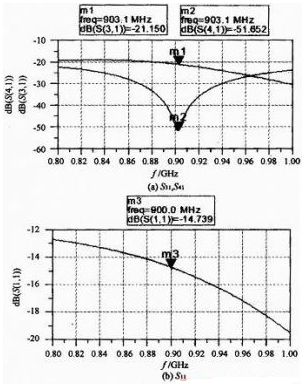 高阻抗線的一個(gè)重要結(jié)論是,其終端到耦合端的電長(zhǎng)度大約為90°。根據(jù)微帶耦合器理論,要達(dá)到最佳的耦合效果,耦合端和隔離端的長(zhǎng)度大約為90°,信號(hào)相位也相差90°。反射信號(hào)要與隔離端信號(hào)相差180°,在高阻抗線終端反射回耦合端的信號(hào)與耦合端原信號(hào)必須反向,這樣才能在傳輸90°以后和隔離端的信號(hào)正好反向。另外通過(guò)改變高阻抗線的線寬,可以調(diào)節(jié)反射信號(hào)的強(qiáng)弱。遵循這一原則,通過(guò)對(duì)高阻抗線的調(diào)節(jié),使得耦合器在 903MHz時(shí),達(dá)到-50dB的隔離度,并使定向性達(dá)到30dB以上。
