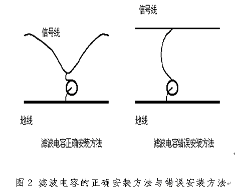 電容的諧振頻率由ESL和C共同決定,電容值或電感值越大,則諧振頻率越低,也就是電容的高頻濾波效果越差。ESL除了與電容器的種類有關外,電容的引線長度是一個十分重要的參數(shù),引線越長,則電感越大,電容的諧振頻率越低。因此在實際工程中,要使電容器的引線盡量短,電容器的正確安裝方法和不正確安裝方法如圖2所示。