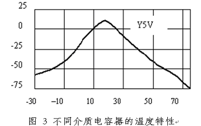 由于電容器中的介質參數(shù)受到溫度變化的影響,因此電容器的電容值也隨著溫度變化。不同的介質隨著溫度變化的規(guī)律不同,有些電容器的容量當溫度升高時會減小70%以上,常用的濾波電容為瓷介質電容,瓷介質電容器有超穩(wěn)定型:COG或NPO,穩(wěn)定型:X7R,和通用型:Y5V或Z5U三種。不同介質的電容器的溫度特性如圖2所示。