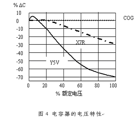 電容器的電容量不僅隨著溫度變化,還會隨著工作電壓變化,這一點在實際工程必須注意。不同介質材料的電容器的電壓特性如圖3所示。從圖中可以看出,X7R電容器在額定電壓狀態(tài)下,其容量降為原始值的70%,而Y5V電容器的容量降為原始值的30%!了解了這個特性,在選用電容時要在電壓或電容量上留出余量,否則在額定工作電壓狀態(tài)下,濾波器會達不到預期的效果。