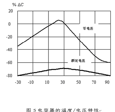 從圖中可以看到,COG電容器的容量幾乎隨溫度沒有變化,X7R電容器的容量在額定工作溫度范圍變化12%以下,Y5V電容器的容量在額定工作溫度范圍內變化70%以上。這些特性是必須注意的,否則會出現(xiàn)濾波器在高溫或低溫時性能變化而導致設備產生電磁兼容問題。