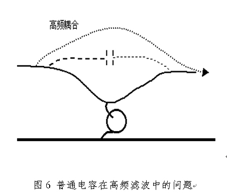 在實際工程中,要濾除的電磁噪聲頻率往往高達數(shù)百MHz,甚至超過1GHz。對這樣高頻的電磁噪聲必須使用穿心電容才能有效地濾除。普通電容之所以不能有效地濾除高頻噪聲,是因為兩個原因,一個原因是電容引線電感造成電容諧振,對高頻信號呈現(xiàn)較大的阻抗,削弱了對高頻信號的旁路作用;另一個原因是導線之間的寄生電容使高頻信號發(fā)生耦合,降低了濾波效果,如圖5所示。