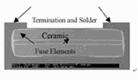 ---AEM SolidMatrix SMD熔斷器與常規片式熔斷器在結構方面具有顯著的不同:它是疊層多元陶瓷獨石結構。所謂多元就是指它具有分離的多層熔斷單元。熔斷單元之間用有很好滅弧作用的陶瓷材料隔開。熔斷單元位于陶瓷結構的中部,夾在較厚的陶瓷層中間(見圖1)。其多層熔斷元件結構可以大大增加熔斷元件與滅弧材料的接觸面積,使滅弧反應的時間縮短。