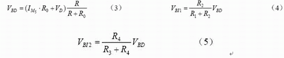 電路的工作原理為:由M1—M4和R5組成的自偏置電路產生具有正溫度系數的電流,它在電阻R0所產生的壓降和具有負溫度系數的PN 結壓降(D0上的壓降)相加,從而輸出零溫度系數的基準電壓VBD;為滿足同一電路中輸出不同的基準電壓源,利用電阻分壓將VBD 分成了VBI1及VBI2輸出;C0和R6組成啟動電路。
