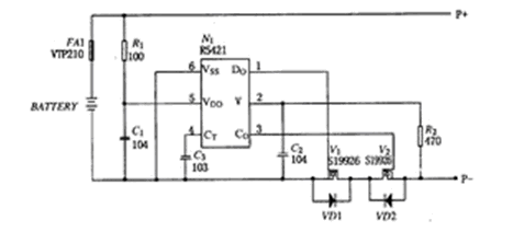 鋰離子電池保護(hù)電路包括過度充電保護(hù)、過電流/ 短路保護(hù)和過放電保護(hù)等,該電路就是要確保這樣的過度充電及放電狀態(tài)時的安全,并防止特性劣化。它主要由集成保護(hù)電路IC、貼片電阻、貼片電容、場效應(yīng)管(MOSFET) 、有的還有熱敏電阻(NTC) 、識別電阻( ID) 、保險絲( FUSE) 等構(gòu)成。其電路圖如圖1所示。