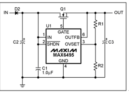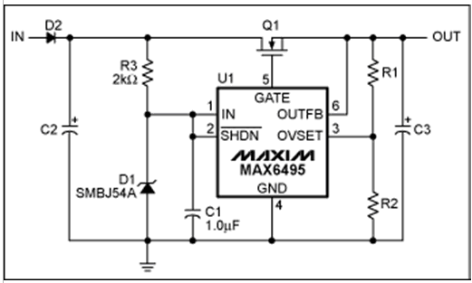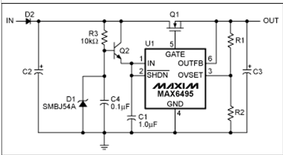 過壓保護(OVP)器件數(shù)據(jù)資料中提供的典型電路可以滿足大多數(shù)應(yīng)用的需求(圖1)。然而,有些應(yīng)用需要對基本電路進行適當(dāng)修改。本文討論了兩種類似應(yīng)用:增大電路的最大輸入電壓,在過壓情況發(fā)生時利用輸出電容存儲能量。