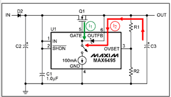 MAX6495–MAX6499/MAX6397/MAX6398通過內(nèi)部100mA的電流源(見圖4)連接到GATE輸出,以對柵極電容和輸出電容放電。電流源先對GATE放電(電流I1,綠色箭頭),直到GATE的電壓等于OUTFB電壓,然后斷開FET,電流源繼續(xù)降低GATE電壓,最后,直到內(nèi)部的箝位二極管變?yōu)檎蚱?,對輸出電容放?電流I2,紅色箭頭)。