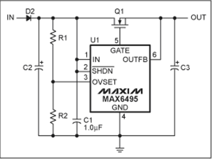 MAX6495–MAX6499/MAX6397/MAX6398過壓保護(OVP)器件用于保護后續(xù)電路免受甩負載或瞬間高壓的破壞。器件通過控制外部串聯(lián)在電源線上的n溝道MOSFET實現(xiàn)。當(dāng)電壓超過用戶設(shè)置的過壓門限時,拉低MOSFET的柵極,MOSFET關(guān)斷,將負載與輸入電源斷開。