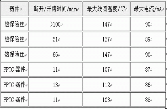 在變壓器中采用PPTC保護器件,則既簡單又節省成本。只用一個額定電壓為240V(AC)的PPTC器件,安裝在變壓器的原邊,就可代替兩個熱保險絲實現超溫及過流保護。當故障發生時,在線圈溫度升高但電流并沒有顯著的增加的情況下,電路保護元件中的超溫器件就顯得非常重要。低功率電源變壓器是此應用的一個很好的實例。即使副邊有短路發生時,PPTC器件的電阻將增大,電流被限制在很低的范圍內,起到保護變壓器的作用,避免如圖5那樣毀壞性的故障。表1是一個120V交流變壓器,采用熱保險絲和PPTC器件保護時的比較數據。