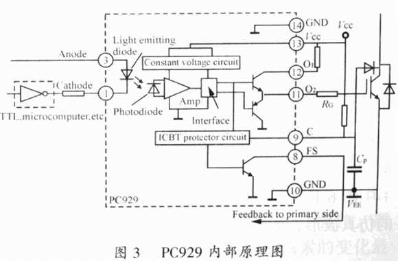 所謂降柵壓慢關斷技術指的是,當IGBT出現過流時,先將其柵極驅動電壓降低,然后將其關斷,一是延長了IGBT能夠承受過流的時間,二是可以降低器件受到過流沖擊的幅度。過流時器件通態壓降升高,管子瞬時熱損耗急劇增加,為防止器件熱損壞,過流時間應足夠短,一般<10μs。SHARP公司的光耦合器PC929將這一功能和驅動電路集成在一起,器件內部原理圖如圖3所示。