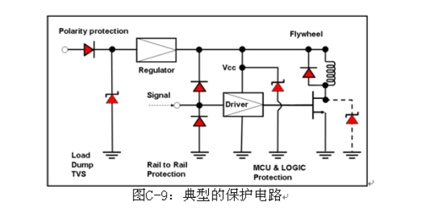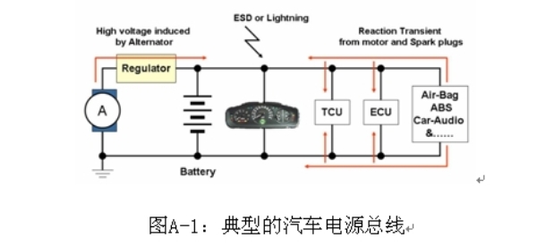 汽車電子,如電子控制單元、傳感器和娛樂系統,都是連接在一根電力線上。這些電子產品的功率來源是電池和發(fā)電機,兩者的輸出電壓都不穩(wěn)定,會受到溫度、操作狀態(tài)和其他條件的影響。此外,由于這些系統使用了螺線管負載,如燃料噴射、氣門、發(fā)動機、電氣和水解控制器,ESD、尖峰噪聲和各種瞬變及浪涌電壓都會進入電源及汽車系統的信號線。