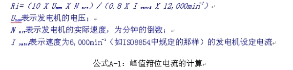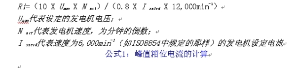 對于14 V系統的大型發(fā)電機來說,由以下ISO7637-2和ISO-8854的公式1)得出的220 A的發(fā)電機內阻為0.33 Ω,300 A型的內阻為0.24 Ω。