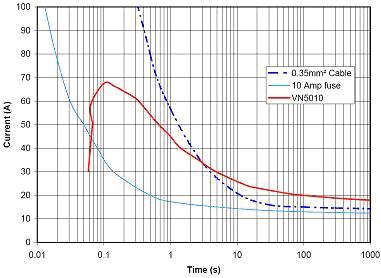 像硬短路一樣的短路事件比較容易保護,例如,受驅動器限制的負載電流。在這種情況下,功耗不是I2R的結果,而是驅動器上的電壓降與相應的限流的結果。這是一個高功耗事件,大部分功耗發生在智能開關上而不是線束上。因此,開關的溫度迅速升高,激活過熱關斷功能,從而保護相關的線束。[page]