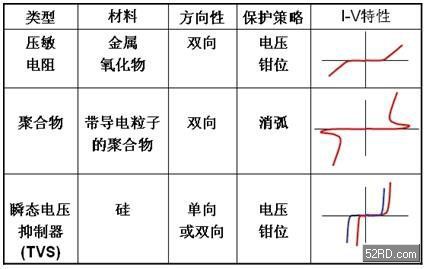 安森美半導體來自美國的ESD保護專家RobertAshton博士說,一般而言,ESD保護元件的分類可以通過其保護策略與方向性來進行,主要包括壓敏電阻、聚合物和瞬態電壓抑制器(TVS)等,如表1所示。在這幾種保護元件中,壓敏電阻在低電壓時,呈現出高電阻,其中的每個小型二極管兩端的電壓都相當低,同時電流也相當小;而在較高電壓時,其中的獨立二極管開始導通,同時壓敏電阻的電阻會下降。從表1中我們也可以看出壓敏電阻為雙向保護元件。而對于帶導電粒子的聚合物而言,在正常電壓下,這些材料擁有相當高的電阻,但當發生ESD沖擊時,導電粒子間的小間隙會成為突波音隙陣列,從而帶來低電阻路徑。