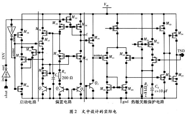 整個工作過程中,TSD的正反饋起到了遲滯的作用。使得正常工作時,TSD輸出高電平作用于電路其它模塊。當溫度過高時,TSD輸出低電平作用于電路其它模塊,使芯片停止工作,保護芯片。