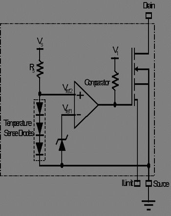 此新型過熱保護電路的關鍵之處就是功率SENSEFET的結溫是通過實際測量而不是估計的。由于該電路所提供的過熱保護不受其它次要因素,如瞬時脈沖、周圍溫度、系統氣流以及銅線面積的影響,使其非常可靠及穩固。